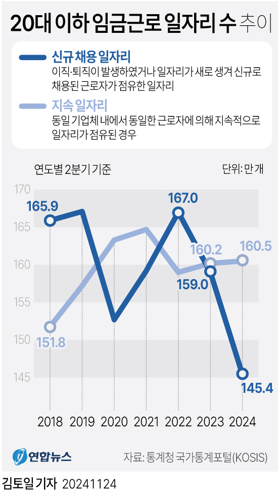 24일 통계청 국가통계포털에 따르면 올해 2분기 20대 이하(10대·20대) 신규 채용 일자리는 145만4,000개로, 지난해 같은 기간에 비해 13만6,000개(-8.6%) 감소했다. 2018년 관련 통계가 작성된 이래 가장 적은 수치다.