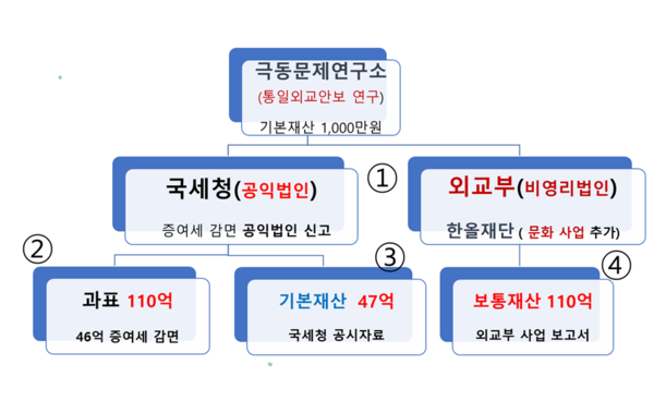 한올재단이 국세청에 신고한 내용과 관리 감독기관인 외교부에 제출한 내용도 달랐다. 한올재단이 국세청 홈페이지에 공시한 재단의 기본재산은 47억원이지만, 외교부 자료에는 보통재산 100억원으로 다르게 공시돼 있고 등기부 등본에는 기본재산이 1,000만원으로 돼 있다. 회계 부정이 의심되는 대목이다. 공익법인∙비영리 법인 등은 재산을 기본재산과 보통재산으로 분류하는데, 통상 증여 받은 재산은 비과세 됨과 동시에 법원에 기본재산 등기를 해야 한다.
