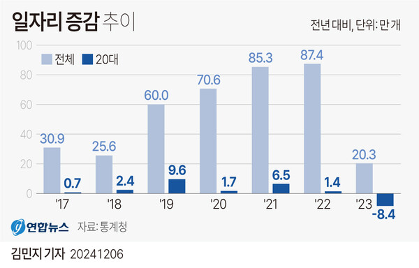 지난해 일자리 증가폭이 역대 가장 작은 20만개(0.8%)에 그쳤고 20대에선 처음으로 감소했다.