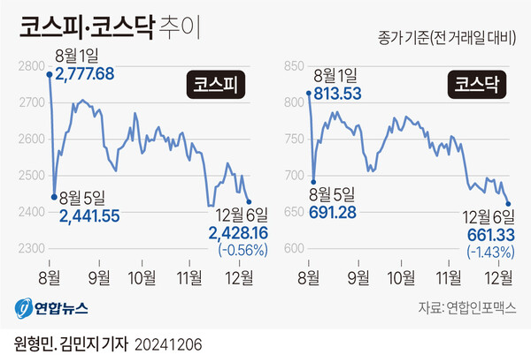 6일 코스피지수는 전거래일 대비 13.69포인트(0.56%) 하락한 2,428.16에 장을 마쳤다. 장중 한 때 2,397.73포인트까지 밀리며 2,400선이 무너지기도 했다.