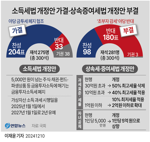 국회는 10일 본회의를 열어 이런 내용의 소득세법 개정안을 재석 275명 중 찬성 204명, 반대 33명, 기권 38명으로 의결했다. 상속세 최고세율을 낮추고 자녀 공제한도를 확대하는 내용의 상속세∙증여세법 일부개정안은 재석 281명 중 찬성 98인, 반대 180명, 기권 3명으로 부결됐다.