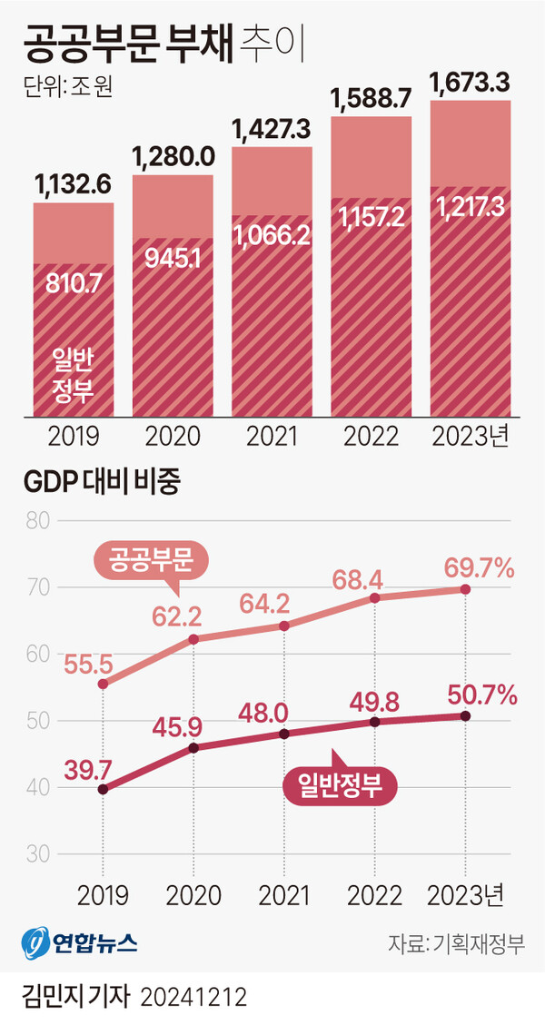 지난해 공공부문 부채는 1,673조3,000억원으로 전년보다 84조6,000억원 증가했다. GDP 대비 비율은 69.7%로 전년보다 1.3%p 상승했다. 공공부문 부채 비율은 2019년 이후 계속 상승하는 추세다.