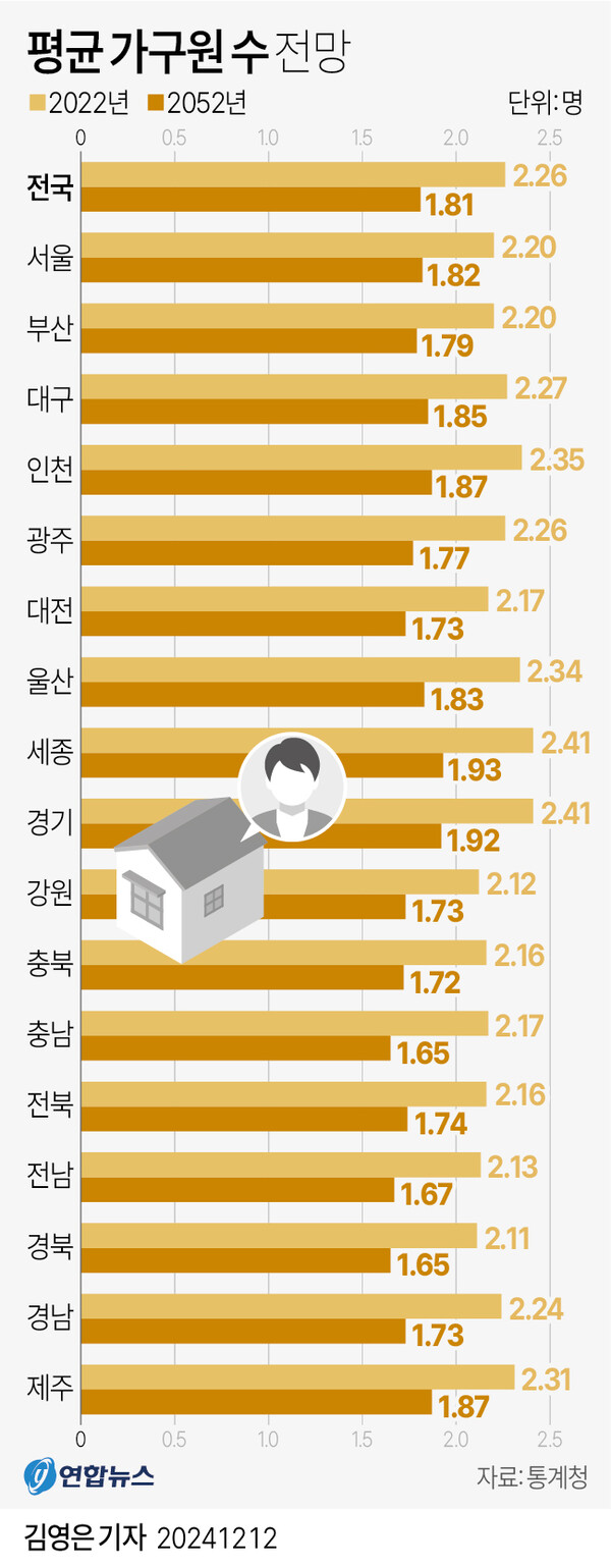 1인가구 비중이 늘어나면서 평균 가구원 수도 줄어든다. 전국 평균 가구원 수는 2022년 2.26명에서 점차 줄어 2052년 1.81명까지 감소할 전망이다. 2022년 기준 평균 가구원 수는 가장 많은 세종·경기 2.41명, 최저인 경북 2.11명 수준이다. 30년 뒤에는 세종(1.93명)을 비롯해 모든 시∙도에서 2명 미만이 될 것으로 추계됐다.