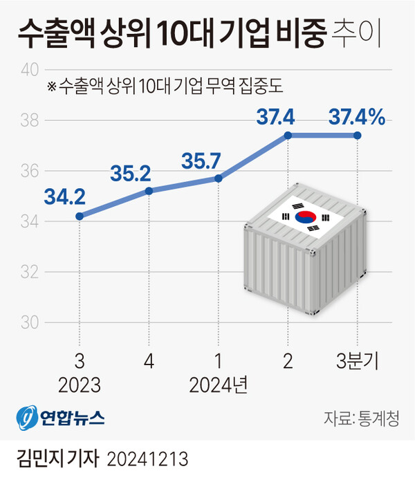 수출액 상위 10대 기업 무역집중도는 전년 대비 3.2%포인트 늘어난 37.4%로 쏠림 현상이 심해졌다. 2018년 3분기(39.4%) 이후 최근 6년 새 가장 높다. 상위 100대 기업 무역집중도 역시 1년 전보다 2.3%포인트 오른 67.6%였다. 2017년 2분기(67.6%) 이후 가장 높은 수치다.
