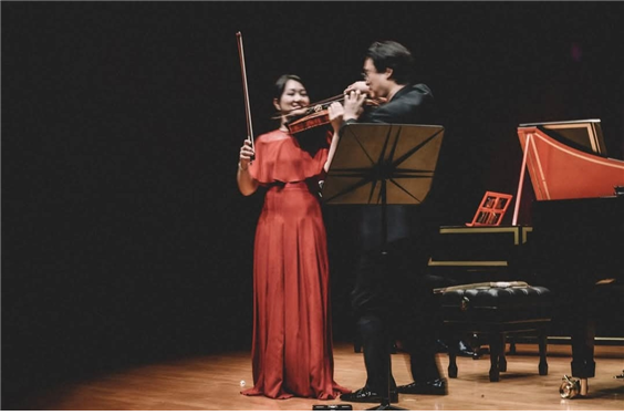 조명 아래 빨간 라인이 들어간 예쁜 쳄발로가 놓여 있고 그 옆에 비올라가 있습니다. 그런데 한 대의 비올라를 가지고 두 명의 남녀 연주자가 각자의 활을 가지고 샴쌍둥이처럼 붙어서 연주를 합니다. 둘이서 피아노 연탄 연주를 하듯이 비올라 한 대를 공유하며 듀엣 연주를 하는 것입니다. 구조상 반대로 활질을 할 수밖에 없습니다. 여자 비올리스트는 엉거주춤한 자세로 그녀의 움직임을 따라다니며 힘겹게 연주하는 남자 비올리스트의 모습이 웃기는지 참지 못하고 연주 중 웃음을 토해냅니다. 그들은 그렇게 연주하며 무대를 가로질러 무대 뒤로 사라졌습니다. 그래도 무대 뒤에서도 연주는 멈추지 않고 계속 이어집니다. 그들이 문을 빼꼼 열고 장난스레 관객석을 향해 손을 흔들며 바이바이를 할 때까지 말입니다.