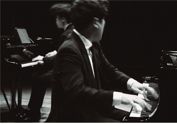 피아노 연주자도 두 명 등장합니다. 그런데 피아노는 한 대입니다. 연탄 연주인가 봅니다. 그 둘은 처음부터 좁은 의자를 가지고 자리 싸움을 하며 엎치락뒤치락 연주를 주고받습니다. 검은 피아노에 검은 조명, 게다가 둘 다 검은 옷을 입어서인가 저속으로 느리게 보면 마치 찰리 채플린의 흑백 무성 영화를 보는 것과도 같은 장면이 연출됩니다. 물론 그들의 표정은 동작만큼이나 심각하지 않습니다. 위의 황제 앞에서 피아노를 친 모차르트처럼 말입니다. 그렇게 한 피아노에서 연주를 마친 그들은 두 대의 피아노에 각각 나눠 앉습니다. 편하게 앉아 듀엣으로 각자의 피아노를 연주하는 것입니다. 이젠 싸울 일이 없을 것 같지만 그들은 서로를 의식하며 피아노를 부술 듯이 쳐댑니다. 마치 누구의 피아노 소리가 더 큰지 배틀을 하듯이 말입니다. 피아노는 현악기일까요? 건반악기일까요? 아님 타악기일까요? 그날은 타악기였습니다.