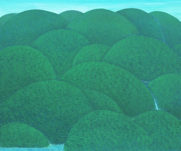 ‘푸른산’ 모티프는 중국에서 시작되었다. 베이징에서 자동차로 수 시간 걸리는 명대(明代)에 조성된 산간 마을을 찾은 적이 있다. 외적의 침입을 막으려 주민들이 집단 이주한 곳으로 뭔가 범접할 수 없는 느낌이 왔다. 펼쳐진 공간을 중심한 리얼리티를 보면서, 진입로, 마을을 둘러싼 산, 거주하는 사람 등등의 연속적 파노라마 풍경 이미지들이 뭉쳐져 시작한 게 짙은 녹색의 둥그런 산등성이를 표현한 ‘푸른산’이다.