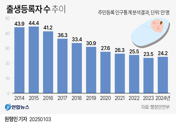 3일 행정안전부가 지난해 주민등록 인구통계를 분석한 결과에 따르면, 우리나라 출생자 수는 24만2,334명으로, 2023년(23만5,039명)보다 7,295명(3.10%) 늘어 9년 만에 증가했다. 2024년 사망(말소)자 수는 36만757명으로 전년보다 6,837명(1.93%) 증가했다.
