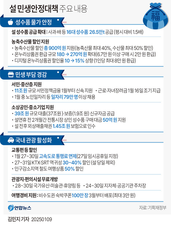 서민·소상공인 등에 대한 정책자금 지원도 이뤄진다. 오영주 중소벤처기업부 장관은 "중소기업 소상공인의 자금 애로 해소를 위해 설 명절 기간에 1조7,000억원을 포함해 올해 총 26조5,000억원의 정책 금융을 신속하게 공급하겠다"고 말했다.