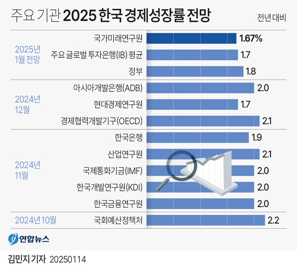 윤석열의 계엄 여파로 정치적 불안이 지속되고 있어 다른 기관들도 성장률 전망치를 낮출 가능성이 있다. 앞서 한국은행은 지난해 11월 올해 성장률 전망치를 2.1%에서 1.9%로 낮췄으며, 2월 수정 경제전망에서 더 낮출 것으로 예상된다.