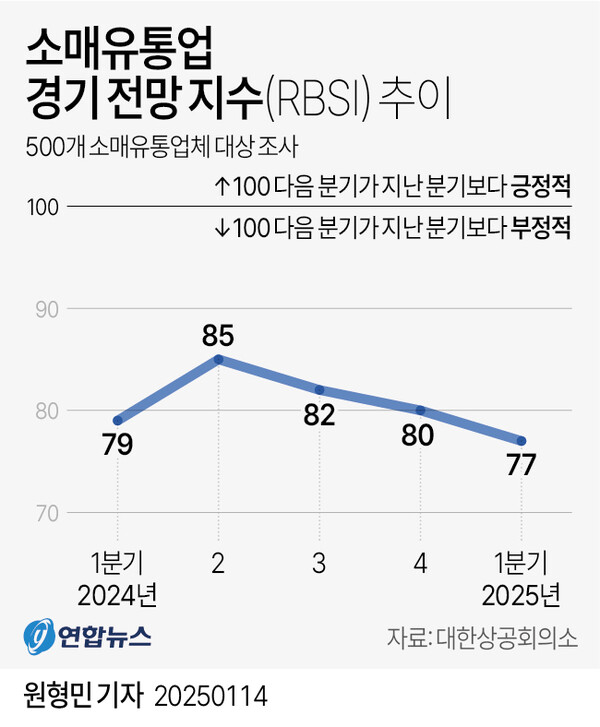 14일 대한상공회의소에 따르면, 500개 소매유통업체를 대상으로 올해 1분기 소매유통업 경기전망지수(RBSI)를 조사한 결과 전망치가 77로 집계됐다고 밝혔다. RBSI가 100 이상이면 다음 분기 소매유통업 경기를 지난 분기보다 긍정적으로 보는 기업이 많다는 뜻이고 100 미만이면 그 반대다.