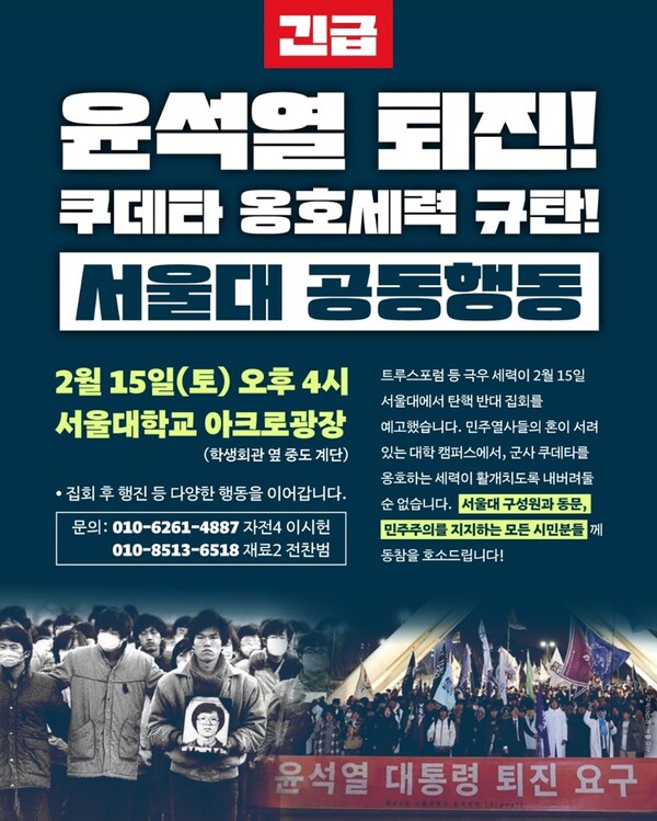 외부 극우세력은 17일 서울대에서 더 크고 강력한 윤석열 지지 집회를 예고했다. 15일 집회를 준비 부족으로 실패했다고 자평하고 더 많은 준비와 인력 동원을 예고하고 나선 것이다. 서울대 학생과 동문들은 제반 민주세력과 연대해 외부 세력을 막아내기로 결의했다. 또한 서울대 민주광장이 극우세력의 정치 선동장이 되는 것을 허용한 서울대 총장에게 강력한 항의 의사도 전달하기로 했다. 서울대 교정을 극단적인 정치 투쟁의 장으로 만들려는 극우의 음모를 분쇄하기 위한 강력한 대책 마련이 절실한 상황이다.