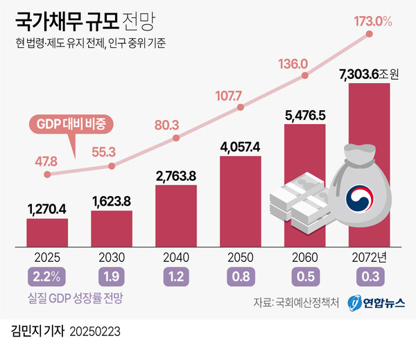 국회예산정책처가 23일 내놓은 '2025~2072년 장기재정전망' 보고서에 따르면, 한국의 국가채무(중앙정부·지방정부 채무 합계)는 올해 약 1,270조원에서 2072년 7,303조,6000억원까지 증가할 전망이다. 국가채무는 2030년 1,623조8,000억원, 2050년 4,057조4,000억원 등 빠르게 늘어날 것으로 추산된다.