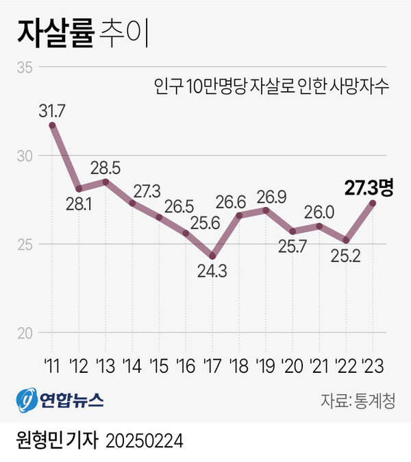 인구 10만명당 자살률은 2022년 25.2명에서 2023년 27.3명으로 상승했다. 자살률은 2011년 31.7명으로 정점을 찍은 뒤 점차 하락해 2017년 24.3명까지 떨어졌다. 이후 상승·하락을 반복하다 2023년 비교적 큰 폭으로 상승하면서 2014년(27.3명) 이후 9년 만에 최고 수준을 기록했다.
