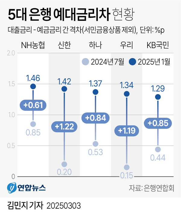 은행별로는 NH농협의 예대금리차가 1.46%p로 가장 컸고, 이어 신한(1.42%p)·하나(1.37%p)·우리(1.34%p)·KB국민(1.29%p) 순이었다. 전체 19개 은행 중에서는 전북은행의 1월 예대금리차가 5.33%p로 1위였다. 2∼4위인 한국씨티은행(2.61%p)·토스뱅크(2.43%p)·광주은행(2.08%p)·BNK부산은행(1.98%p)도 2%p 안팎에 이르렀다.