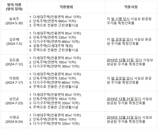 특정건축물을, 건축허가 또는 건축신고 없이 건축대수선한 건축물 또는 사용승인을 받지 못한 건축물, 용도변경 신고를 하지 않은 건축물(송옥주, 김은혜, 이정헌)로 규정했다. 또 특정건축물 중 해당 건축물의 연면적 50% 이상을 주거용 특정건축물로 보고 있다. 적용배제지역은 도시군계획시설 부지, 개발제한구역, 군사시설 보호구역 등으로 정하고, 부설주차장 설치 의무 미적용 특례(송옥주, 김은혜, 이정헌, 남인순)를 규정했다.
