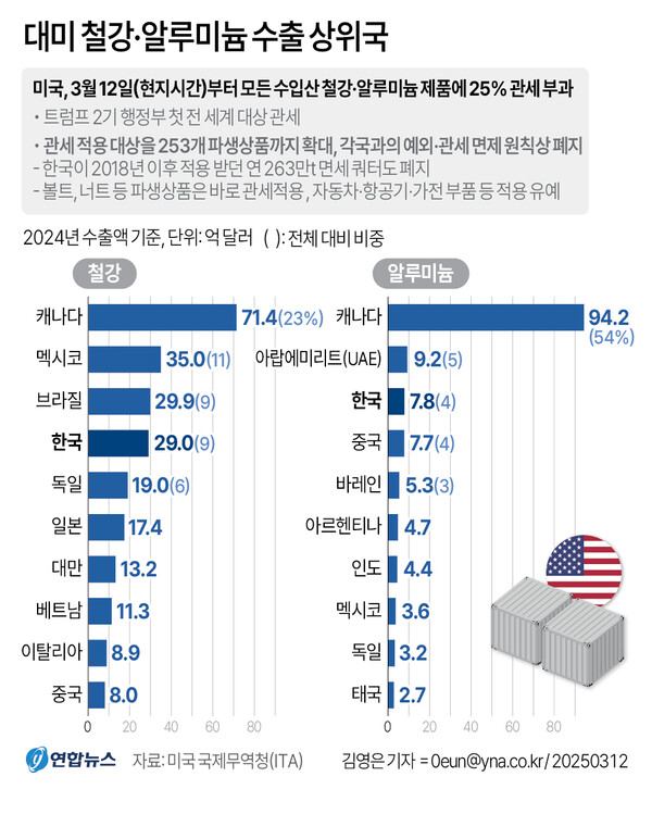 이번 철강·알루미늄 관세는 트럼프 2기 출범 이후 미국의 모든 무역상대국을 대상으로 관세를 부과하는 첫 사례다. 트럼프 대통령은 내달 2일엔 세계 각국의 대미 관세율과 비관세 장벽 등을 고려해 적용하는 '상호 관세'를 부과하겠다고 예고했다.