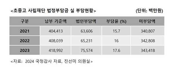 사학재단들의 법정부담금 세금 전가 행위는 비단 예덕학원만의 일은 아니다. 지난해 10월 국회 교육위 소속인 진선미 더불어민주당 의원이 전국 17개 시·도 교육청에서 제출받은 '초중고 사립학교 법정부담금 납부현황'에 따르면 2023년 기준 초중고 사학재단의 법정부담금 부담 납부율은 평균 17.6%에 불과했다. 사학재단들은 재단 맘대로 학교를 운영하면서 매년 내야 할 3,400억원의 법정부담금을 국민에게 떠넘겨왔다.