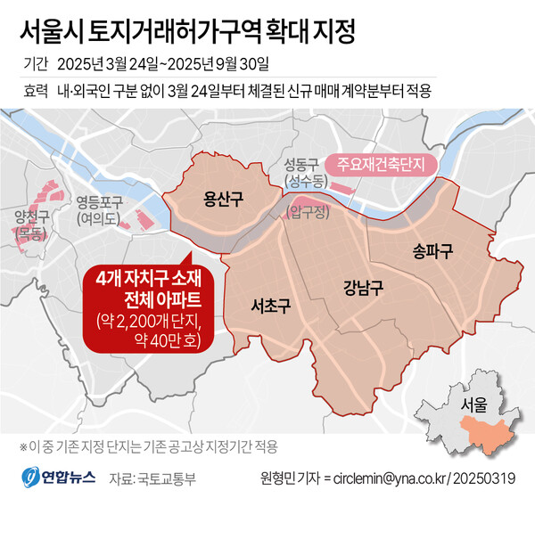 지정 기간은 3월 24일부터 9월 30일까지 6개월이며, 필요하면 기간을 연장할 방침이다. 이달 24일 신규 매매 계약분부터 적용된다. 집값 급등을 막기 위한 토지거래허가구역을 특정 구역이나 동(洞)이 아닌 구 단위로 한꺼번에 지정한 것은 이번이 처음이다. 매번 규제에서 빠졌던 서초구 반포동과 용산구 한남동 아파트도 묶이게 됐다. 이곳에선 2년간 실거주 목적 매매만 허용돼 갭투자가 불가능하다.