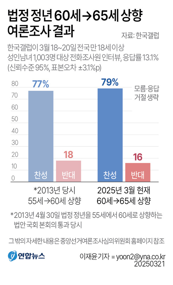 21일 한국갤럽에 따르면, 18∼20일 전국 만 18세 이상 남녀 1,003명을 대상으로 조사(95% 신뢰수준에 표본오차 ±3.1%포인트)한 결과 '정년을 65세로 올려야 한다' 79%, '정년을 60세로 유지해야 한다'는 16%로 나타났다. 4%는 의견을 유보했다.