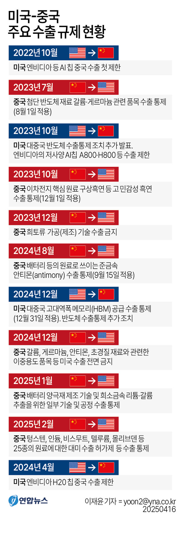 엔비디아는 지난 9일 미 정부에게서 H20 칩을 중국에 수출할 경우 당국의 허가가 필요하다는 통보를 받았다고 15일(현지시간) 밝혔다. 또 14일에는 이 규제가 무기한 적용될 것이라는 통지를 받았다고 전했다. 미 정부는 H20 칩이 중국의 슈퍼컴퓨터에 사용되거나 전용될 수 있다는 우려를 규제의 근거로 들었다고 한다.