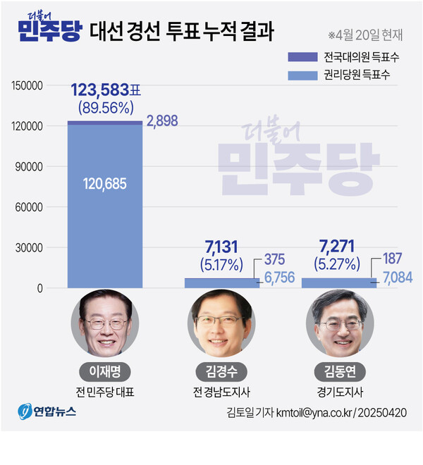전날과 이날 치러진 순회 경선 누적 득표율은 이 후보가 89.56%(12만3,583표)로 집계 됐고, 김동연 후보 5.27%(7,271표), 김경수 후보 5.17%(7,131표)를 각각 기록했다.