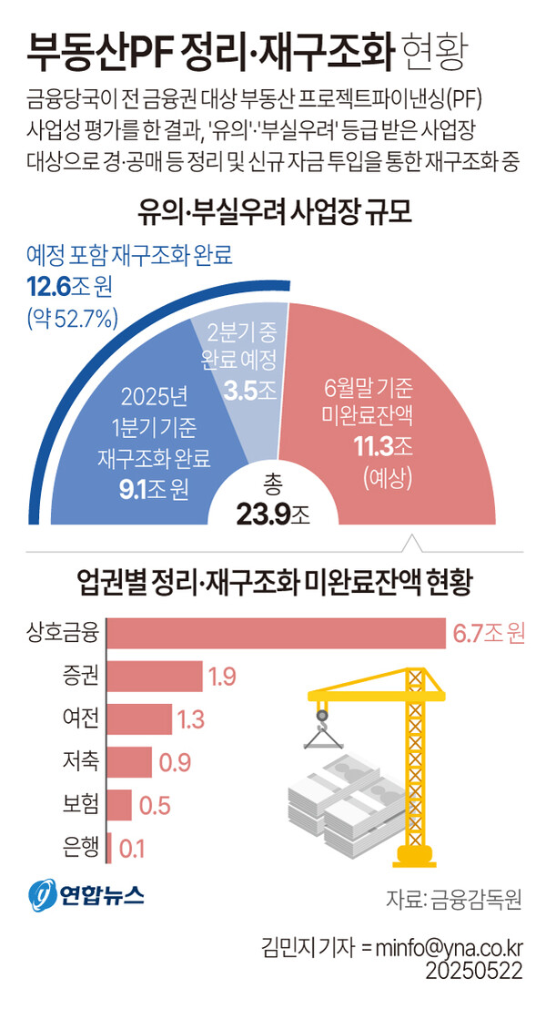금융감독원이 22일 발표한 '전 금융권 부동산 PF 정리·재구조화 경과 및 그간의 실적'에 따르면, 올해 3월 말까지 9조1,000억원이 정리·재구조화됐으며 4∼6월 중 3조5,000억원이 추가로 정리·재구조화될 전망이다.