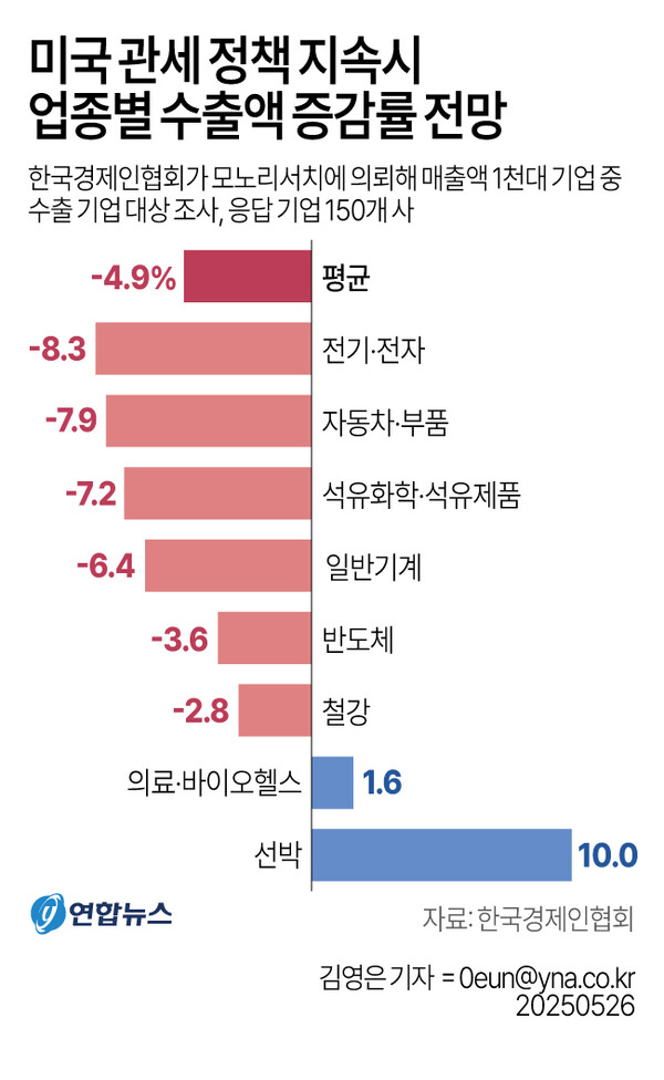 이는 한국산 자동차와 철강에 25% 품목관세, 기타 품목에는 10% 기본관세가 부과되는 것을 감안한 곳이다. 미국이 90일간 유예한 국가별 상호관세(한국 25%)가 정식 발효되면 경제 충격은 더욱 커질 수 있다. 장 연구위원은 "무역 불확실성 확대는 수출 중심의 한국 경제에 큰 영향을 줄 가능성이 있다"며 "미국 무역정책의 직간접적인 효과로 국내 성장률이 약 1%포인트 하락하는 것으로 분석된다"고 지적했다.