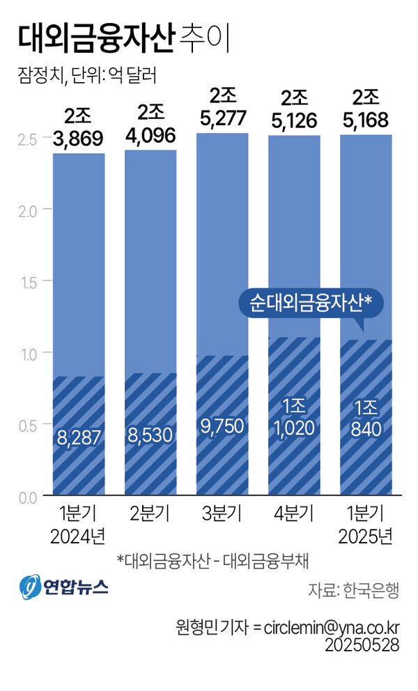 한국은행이 28일 내놓은 '국제투자대조표'에 따르면, 1분기 말(3월 말) 기준 우리나라 대외 금융자산(대외투자)은 2조5,168억달러로 집계됐다. 작년 4분기 말(2조5,126억달러)보다 42억달러 많고, 최대였던 지난해 3분기 말(2조5,277억달러)에 이어 두 번째 규모다.