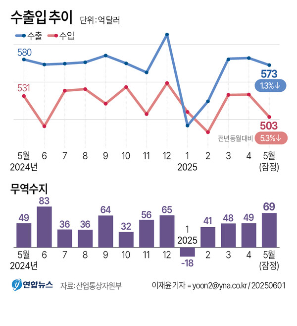 국가별 수출을 보면, ‘트럼프 관세’의 직접 영향을 받는 대미 수출이 100억달러로 8.1% 감소했다. 수출 1위 국가인 대중 수출도 104억달러로 8.4% 줄었다. 5월 수입액은 503억3,000만달러로 작년 대비 5.3% 감소했다. 이로써 5월 무역수지는 69억4,000만달러 흑자를 나타냈다. 무역수지는 올해 1월 잠시 적자를 기록한 것을 제외하면 2023년 6월 이후 계속 흑자를 나타내고 있다.