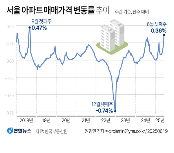 한국부동산원이 19일 내놓은 '6월 셋째 주(16일 기준) 주간 아파트 가격 동향'에 따르면 서울 아파트값은 전주 대비 0.36% 올랐다. 문재인 정부 때인 2018년 9월 둘째 주(0.45% 상승) 이후 최대 상승 폭이다.