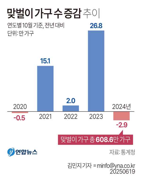 지난해 '맞벌이 부부' 가구가 코로나19 팬데믹 이후 4년 만에 감소한 것으로 나타났다. 1인 가구는 1년 새 60만 가구 넘게 늘면서 800만 가구를 넘어섰다.