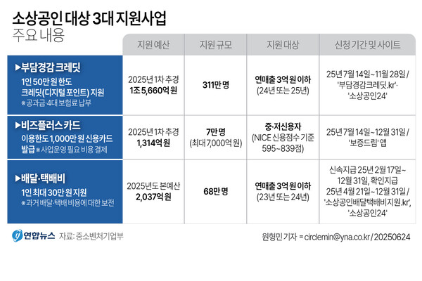 중소벤처기업부는 24일 소상공인 대상 3대 지원사업을 다음 달부터 본격적으로 시행한다고 밝혔다. 3대 지원사업은 작년 7월 발표한 소상공인·자영업자 종합대책 후속으로, 본예산에 편성돼 2월부터 지원되고 있는 '배달·택배비 지원사업'과 추경에 반영한 '부담경감 크레딧', '비즈플러스카드' 사업이다.