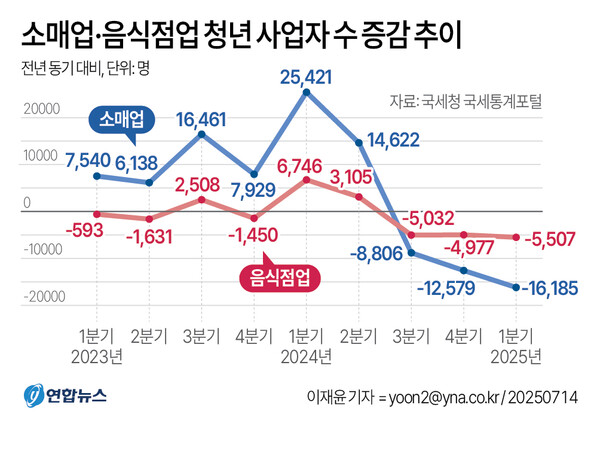 청년 사업자는 코로나19 팬데믹 시기인 2020∼22년에도 매 분기 늘었고, 고금리 여파로 폐업자가 급증한 2023년에도 2분기(2,211명)와 4분기(6,779명) 증가세가 유지됐다. 하지만 작년 3분기 처음 감소(-1만9,400명)했고, 이어 4분기(-2만1,527명)와 올해 1분기에는 감소 폭이 더 커졌다.