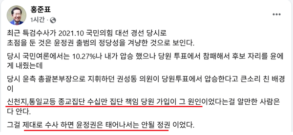 홍 전 시장은 이어 "당시 국민여론에서는 10.27%나 내가 압승 했으나, 당원 투표에서 참패해서 후보 자리를 윤에게 내줬다"며 "당시 윤측 총괄본부장으로 지휘하던 권성동 의원이 당원투표에서 압승한다고 큰소리 친 배경이 신천지·통일교 등 종교집단의 수십만 집단 책임 당원 가입이 그 원인이었다는걸 알만한 사람은 다 안다"고 덧붙였다. 당시 국민의힘 대선 경선 과정에서 통일교와 신천지가 조직적으로 동원됐다는 주장이다.
