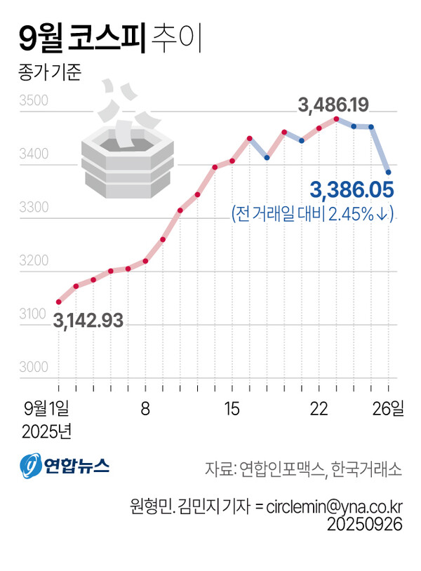 26일 국내 증권시장에서 코스피는 전장 대비 85.06포인트(2.45%) 내린 3,386.05에 장을 마치며 3거래일 연속 하락세를 나타냈다. 종가 기준 3,400선을 밑돈 것은 12일(3,395.54) 이후 10거래일 만이다. 지수는 한때 3,365.73까지 떨어졌다. 코스닥도 전장 대비 17.29포인트(2.03%) 내린 835.19에 거래를 마치며 4거래일 연속 하락했다.