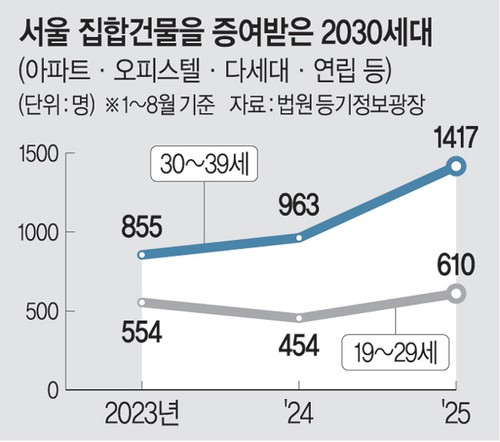 법원 등기정보광장에 따르면 올해 1~8월 서울 집합건물(아파트·연립·다세대·오피스텔·상가 등)을 증여받은 2030세대(19~39세)는 2,027명으로, 작년 같은 기간(1,417명)보다 43.04% 치솟았다. 20대 수증인은 34.4%, 30대는 47.1% 증가했다. 같은 기간 서울 부동산을 물려받은 미성년자 또한 162명으로 작년보다 25.6% 늘어났다.