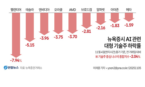 이날 국내 증시는 단기간 급등으로 가격 부담이 커진 가운데 '버블' 논란에 시달리던 미국 인공지능(AI) 관련주가 급락하면서 하방 압력을 받았다. 간밤 골드만삭스의 데이비드 솔로몬 최고경영자(CEO)는 "향후 12∼24개월 사이에 주식시장이 10∼20% 하락할 가능성이 있다"며 투자심리에 찬물을 끼얹었다. 미국 백악관이 엔비디아의 최첨단 인공지능(AI) 칩 '블랙웰'을 중국에 수출할 수 없다고 거듭 확인하면서 엔비디아 주가가 4% 가까이 급락한 것도 기술주 투자심리를 위축시켰다. 원∙달러 환율 급등 또한 외국인의 매도세를 자극한 것으로 보인다.