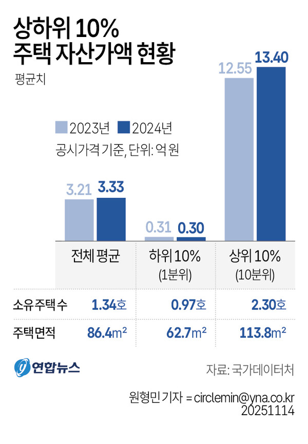상위 10%의 평균 주택 자산가액은 13억4,000만원으로, 하위 10% 평균 주택 자산가액(3,000만원)의 44.7배에 달했다. 2023년(40.5배)보다 자산 격차가 심화하는 모습이다. 상위 10%는 1년 새 약 9,000만원 올랐고, 하위 10%는 100만원 내렸다. 상위 10% 소유자는 평균 2.3호를 소유해 하위 10%(0.97호)보다 배 이상 많았다. 평균 주택 면적도 상위 10%(113.8㎡)가 하위 10%(62.7㎡)보다 1.8배 많았다.