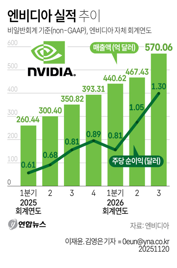 엔비디아는 자체 회계연도 3분기(8∼10월) 매출액이 지난해 같은 기간 대비 62% 증가해 사상 최대인 570억1,000만 달러(약 83조4천억원)를 기록했다고 19일(현지시간) 밝혔다.