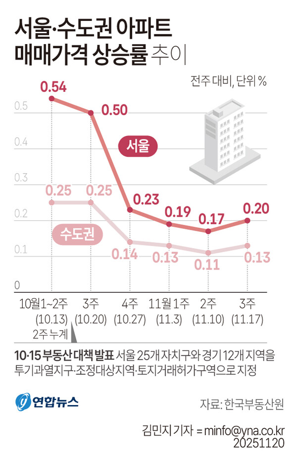 한국부동산원이 20일 내놓은 11월 셋째 주(11월17일 기준) 주간 아파트 가격 동향에 따르면, 서울 아파트 평균 매매가격은 전주 대비 0.20% 올랐다. 상승률은 10월 셋째 주(10월20일 기준) 0.50%를 기록한 뒤 같은 달 넷째 주(10월27일 기준) 0.23%, 11월 첫째 주(11월3일 기준) 0.19%에 이어 전주에는 0.17%까지 축소 흐름을 이어가다 4주 만에 다시 확대됐다. 부동산원은 "매수 문의가 감소하고 관망세가 지속되는 가운데 재건축 추진 단지 및 정주 여건이 양호한 선호 단지 위주로 상승거래가 체결되며 서울 전체적으로 상승했다"고 설명했다.